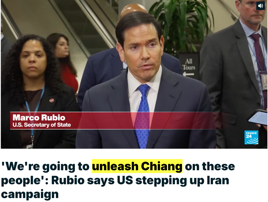 在开场白中,鲁比奥对伊朗发出严厉警告,并引用一句消失已久的政治黑话:Unleash Chiang。